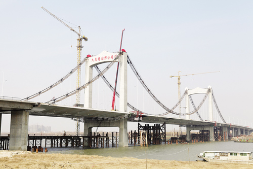 昨天上午,記者登上大慶路淮河公路橋主橋面時,熱鬧的施工現場與寒冷的天氣形成了鮮明的對比。大橋最南端的接線上,幾臺機器正在攤鋪最后一層瀝青。大慶路淮河公路橋建設指揮部技術質量部部長薛峰告訴記者,橋面瀝青一天之內就能鋪好。“瀝青是最后一道主要工序,完成后就標志大橋主體大功告成了。”